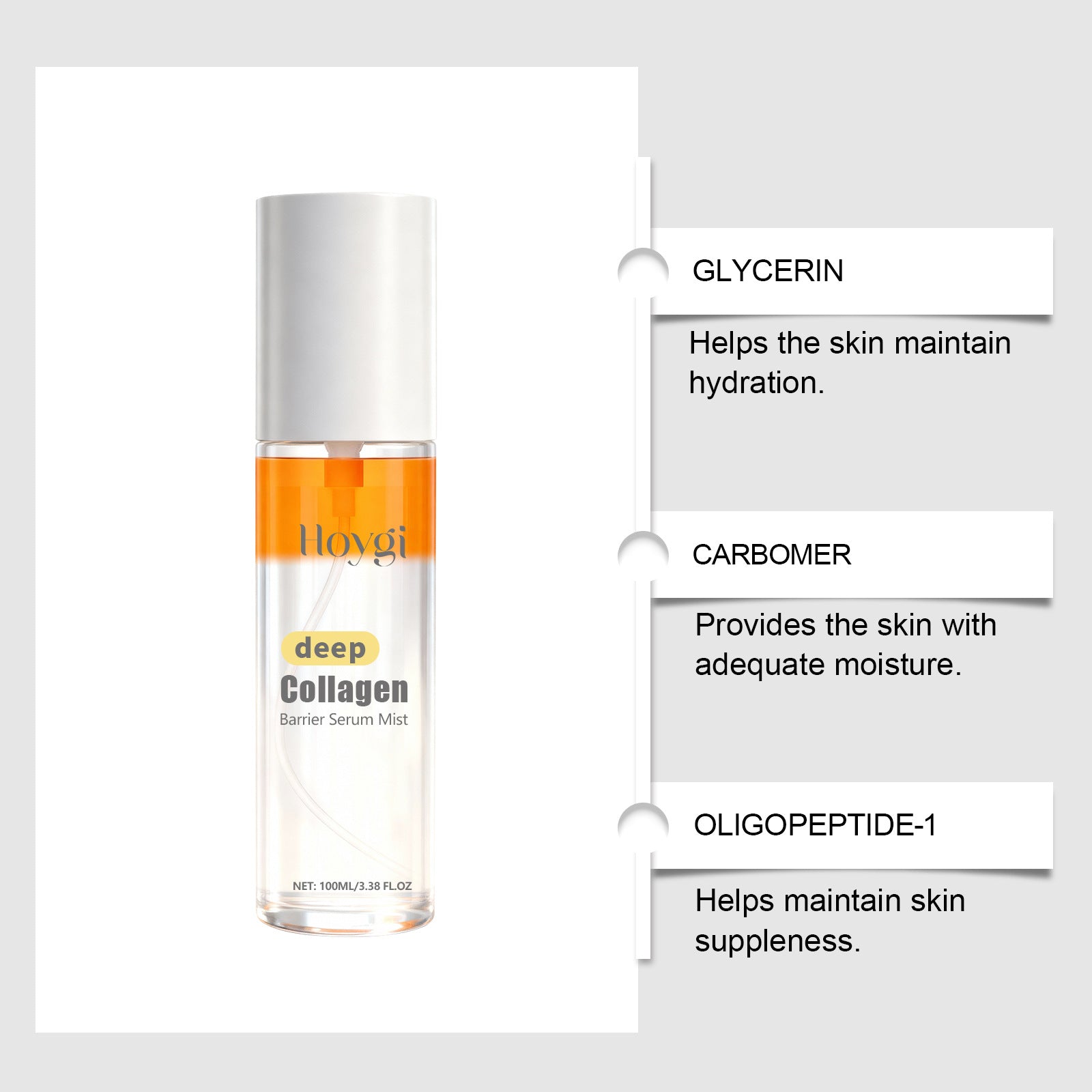 Product information: Ingredients: water, glycerin, 1,2- hexanediol, carbomer, arginine, allantoin, hydrolyzed collagen, oligopeptide -1, ascorbic acid (vitamin C). Packing list: Spray *1